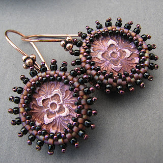 Here is a close-up of one of her pieces, an adorable set of hand-beaded earrings, made of stamped and painted polymer clay with a beaded bezel. So unusual!